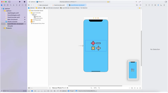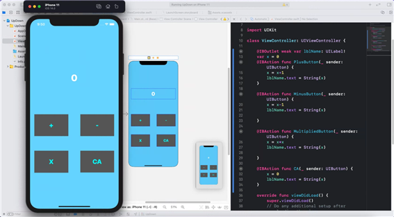 스토리보드와 실행 화면이다. CA버튼은 변수 x를 0으로 초기화시키는 버튼이다.